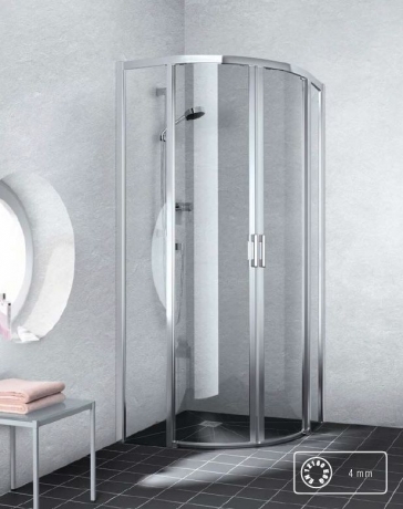 Čiastočne rámový štvrťkruhový sprchový kút s dvomi posuvnými segmentami a dvomi pevnými dielmI.